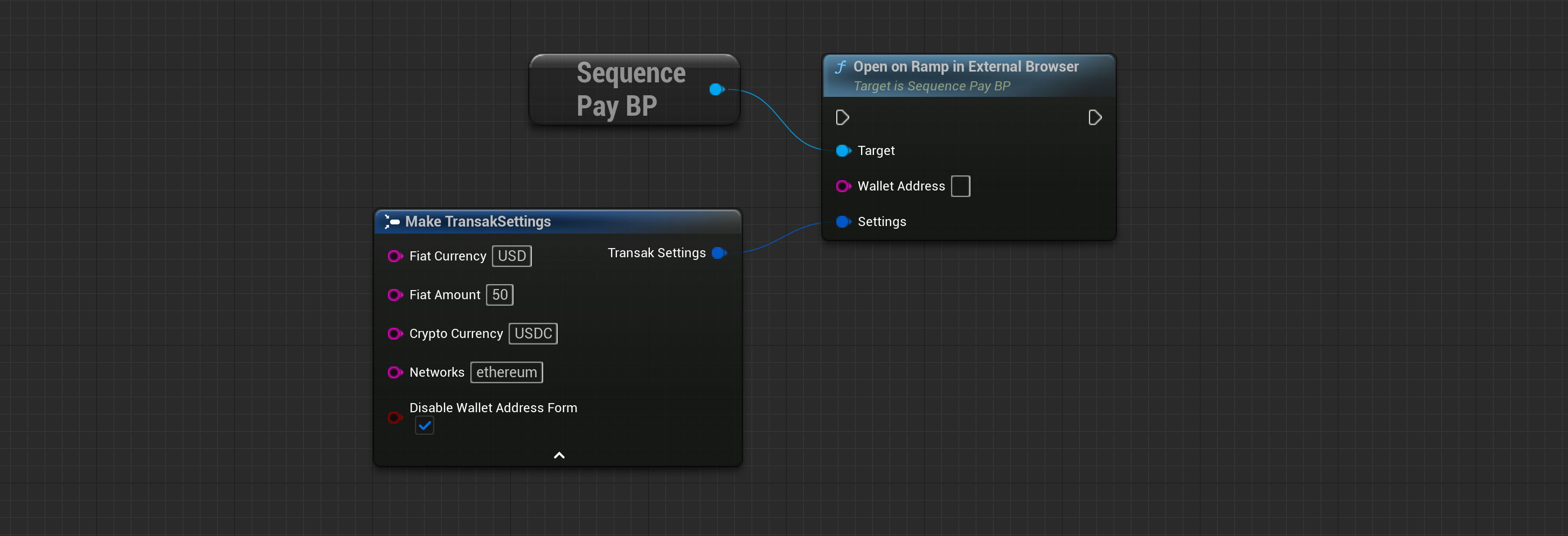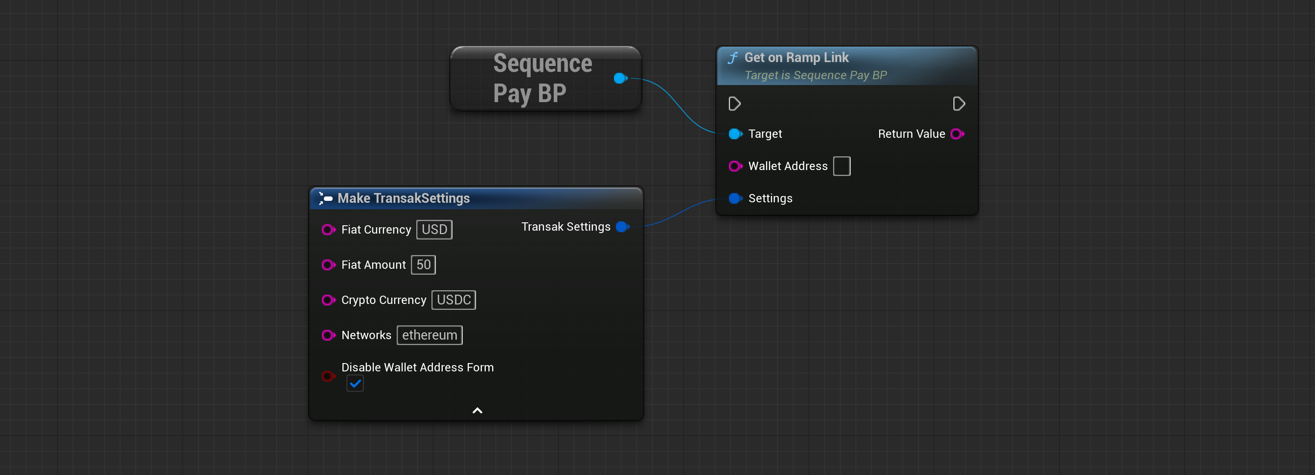 FString OnRampLink = Transak->GetTransakLink("USD", "100", "BTC", "network1,network2", false);