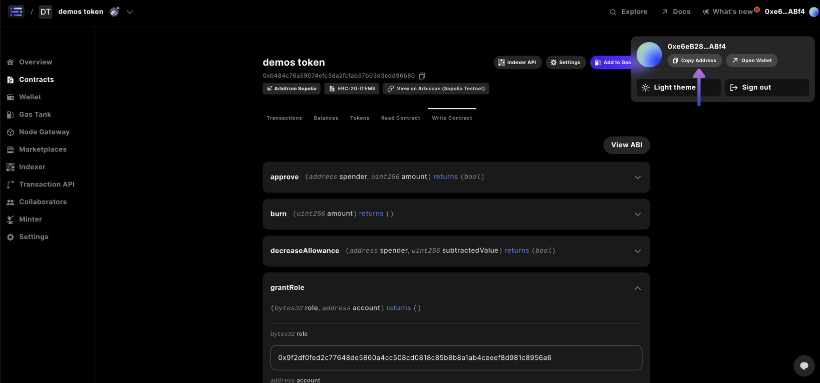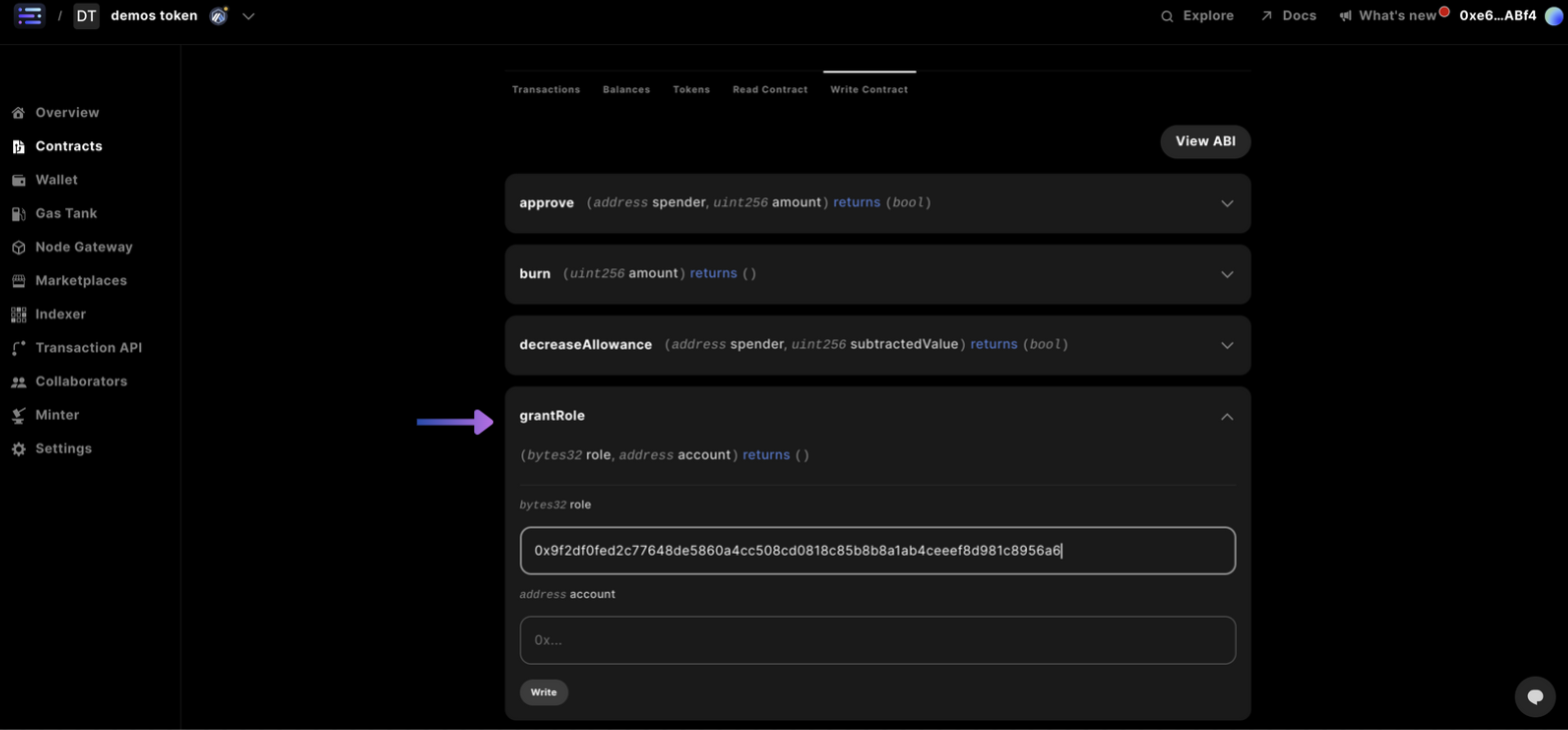 In the grantRole section of the write contract tab navigation, complete with the following details: