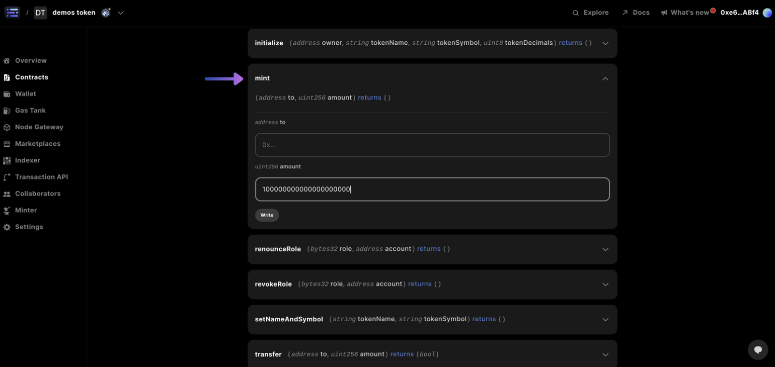 Navigate to the mint card in the Write Contract section and input your wallet address that you would like to receive tokens to and amount of tokens in 18 decimals. So for 100 tokens you would input: 100000000000000000000