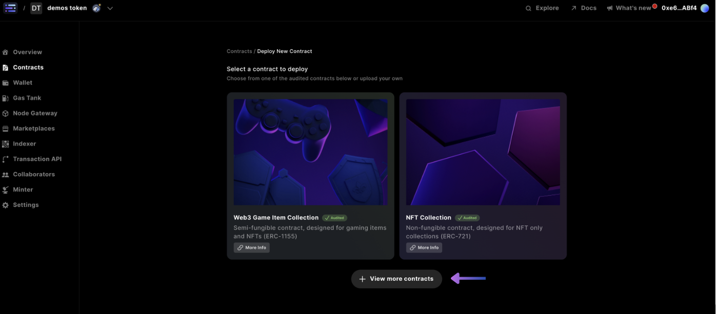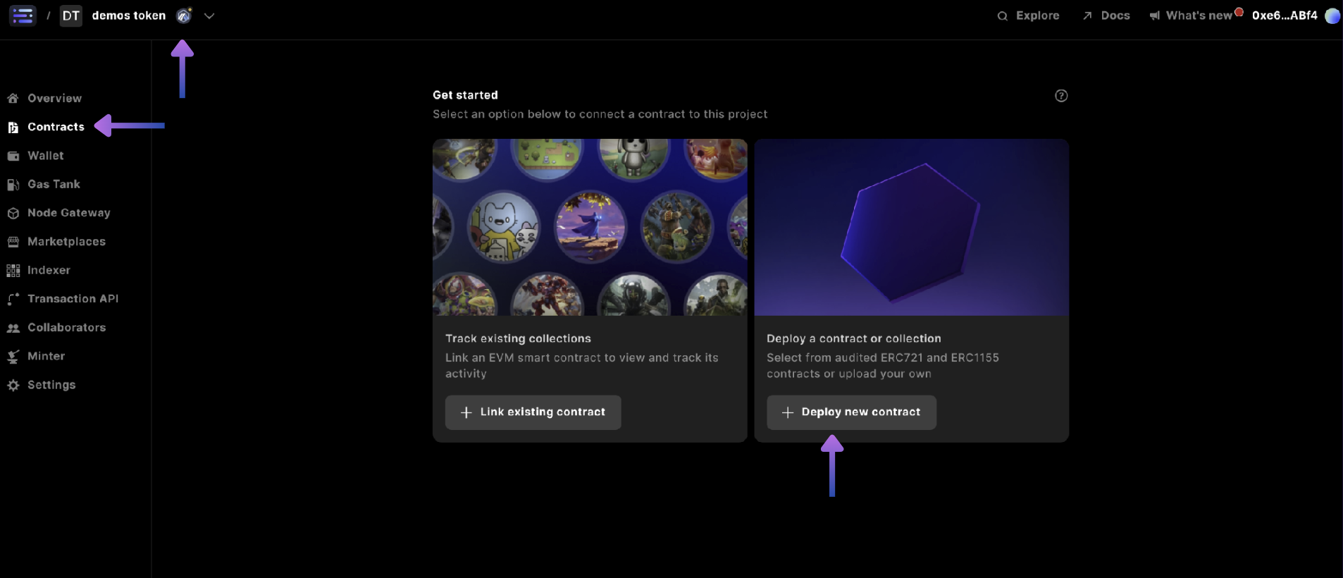 Start by selecting your project in the top left and corner for what you want to create the currency for, and head to the contracts section and select + Deploy new contract