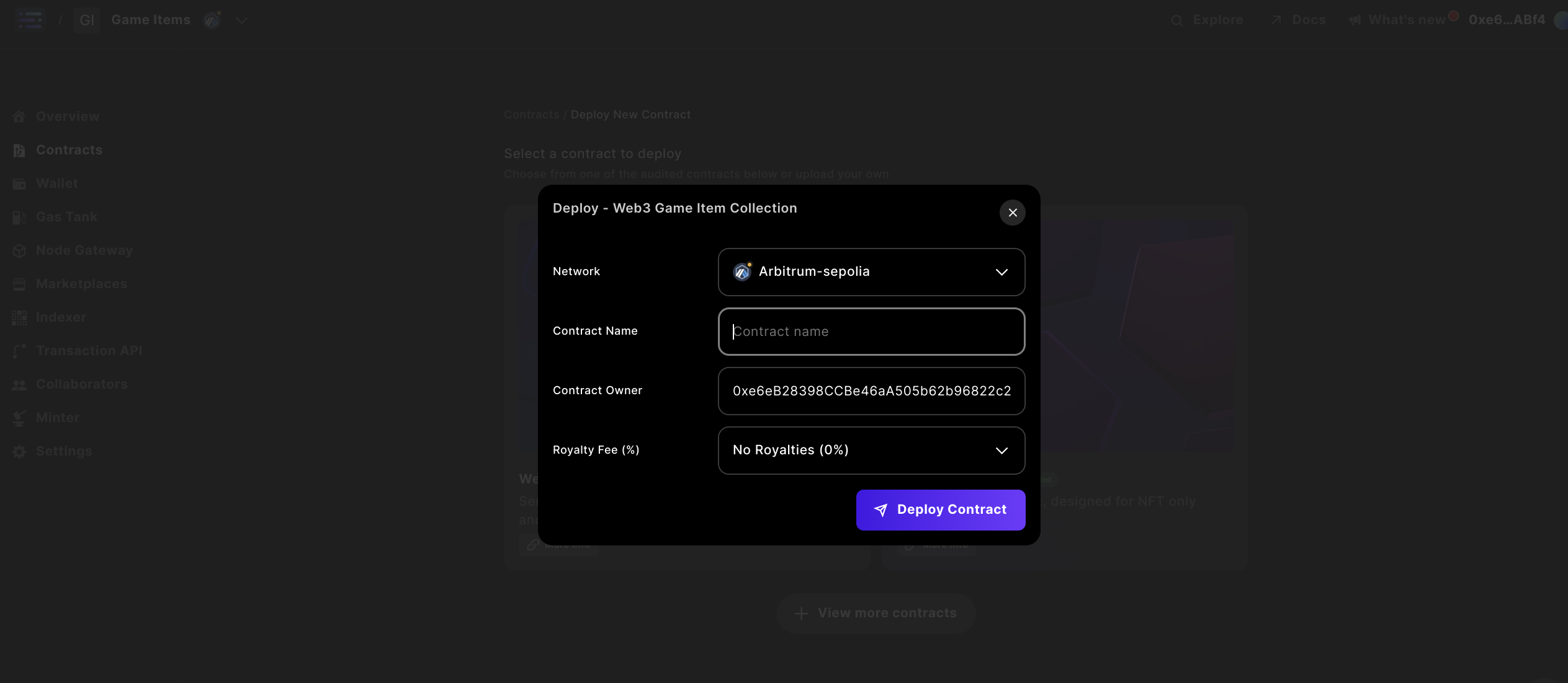 Complete the contract details by specifying a Contract Name and Owner for your contract, with the option to input Royalties. Make sure the Owner address is the Sequence Wallet in the top-right hand corner and that you have funds in this wallet on mainnet, otherwise on testnet - we sponsor these transactions for you.