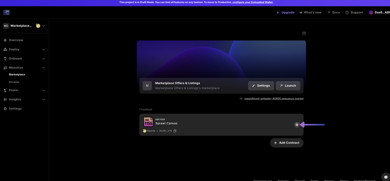 Next, select the + Add contract button, and copy and paste a contract address into the field to search and include on the marketplace.